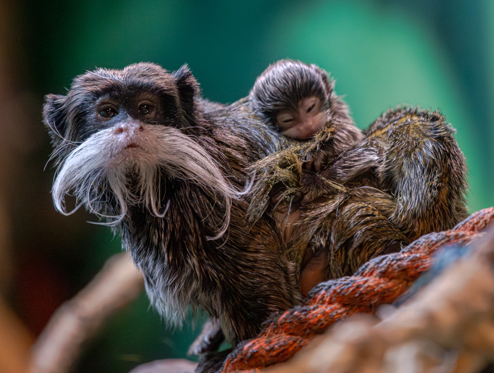 Bearded Emperor Tamarins were named after a German Emperor because of the similarity in their long, curled moustache. The hairs on the moustache and beard are typically white, with darker brown, black and yellow fur covering the rest of the body. Females generally give birth to twins and males carry the young after birth, only passing to the mother for feeding.