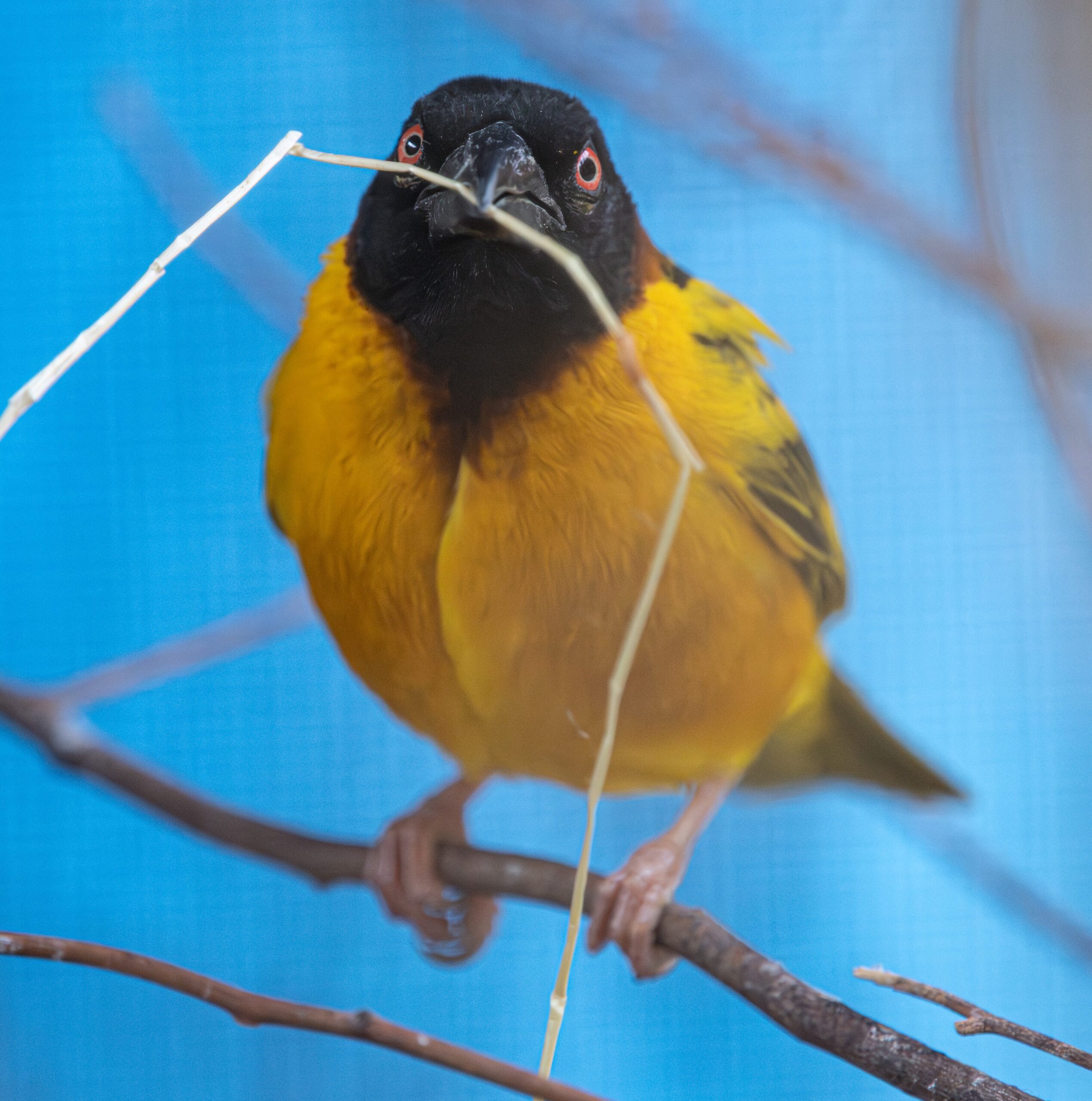 Black-headed weavers have yellow feathers with a distinctive black head and red eyes. Males will be more brightly coloured than females, particularly during breeding season. The males are the nest builders, but if the nest is not to the female’s satisfaction, he will have to continue working on it until she is satisfied with its construction.