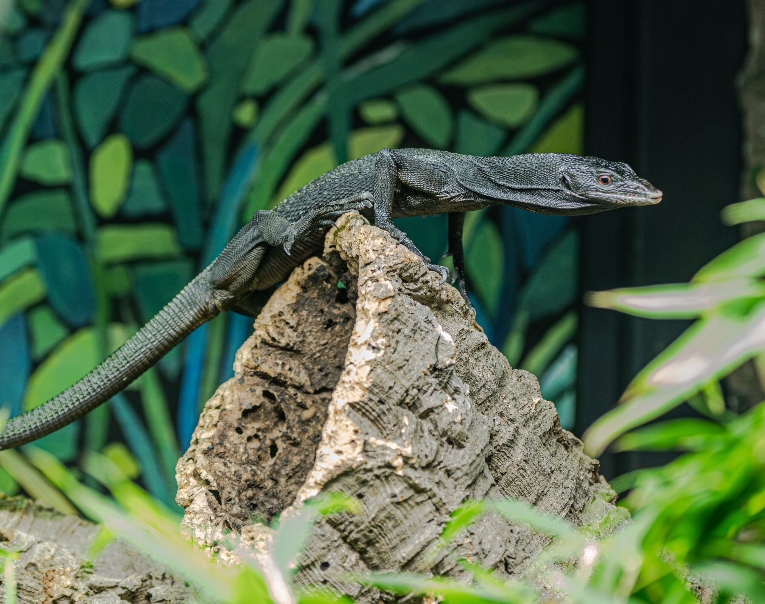 A relatively small lizard species, over 2/3 of its total body length is made up of their prehensile tail. This tail helps them balance and grip branches in the tree canopy or while on the ground searching for food. Black tree monitors are born green and turn black once they reach adulthood.