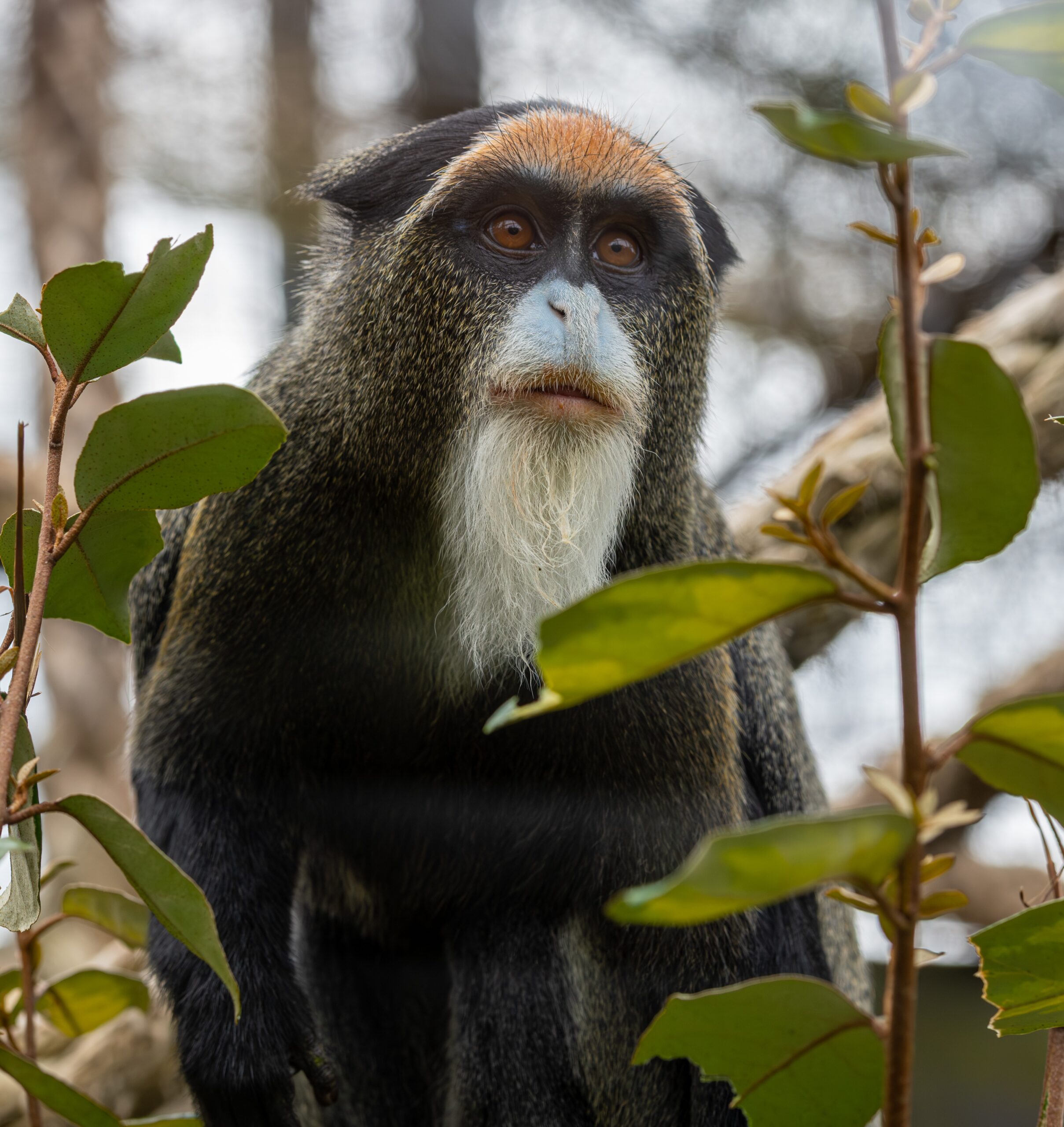 Individuals have a grey coat while their limbs have black fur and a white streak along the hindlimbs. They have brown eyes, an orange crest on their forehead, a black crown, and a white beard. Males are significantly larger than females but the length of the tail will exceed the length of the head and body for both.