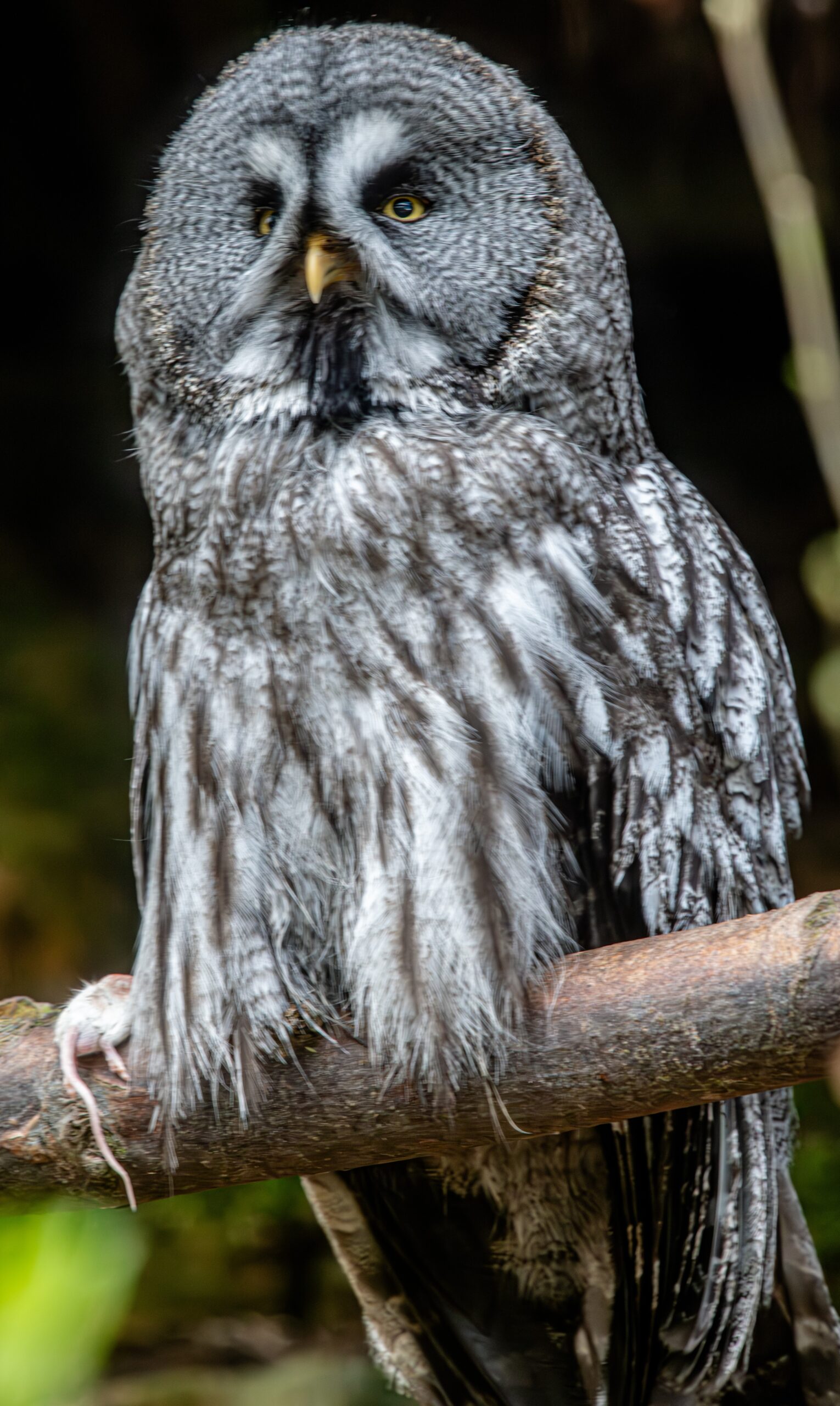One of the largest owl species by length, the Great Grey Owl is patterned in brown and white, with some mottling and some barring on the feathers. They possess a large facial disc with bright yellow eyes, though they do not have the ear tufts found in other owls. As in other owls, their eyes are immobile but the extensive rotation of their heads allows them to track prey in the forest and meadow spaces.