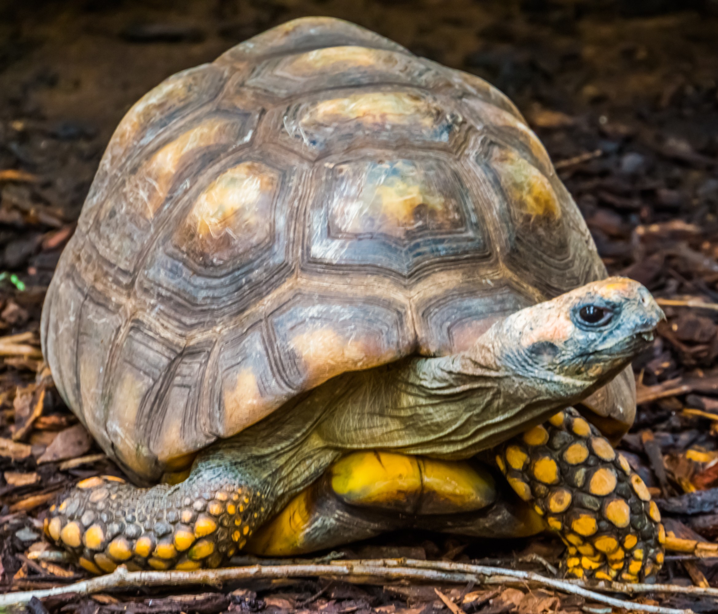 Named for the distinctive yellow scales on their legs and brown and yellow hue to the scutes (bony plates) that make up their shell, the Yellow-footed Tortoise is native to South America. They are primarily a terresterial (land dwelling) rather than aquatic turtle species. They are generally a solitary species, though individuals have been observed sharing space to access resources such as fallen fruit on the forest floor. The Yellow-footed Tortoise is the largest mainland tortoise in South America.